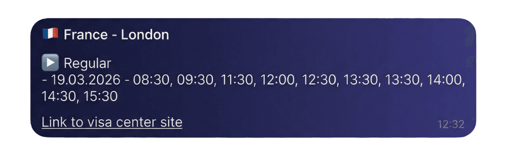 Visard updates visa centres websites every 3 seconds. If there are available time slots, it sends notifications at the same moment.