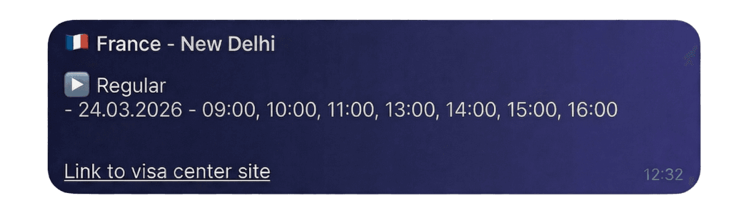 Visard updates visa centres websites every 3 seconds. If there are available time slots, it sends notifications at the same moment.