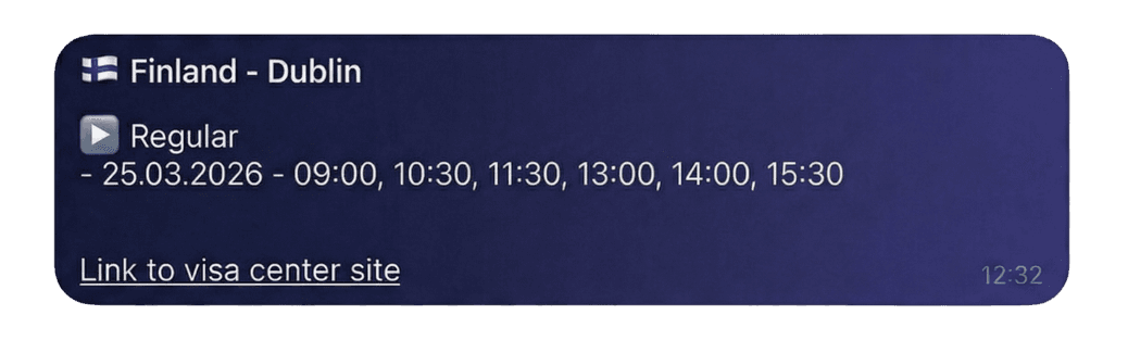 Visard offers a seamless alternative to manual booking. Our Telegram bot scans appointment slots every few seconds, provides real-time alerts, or books automatically for you. No personal data is required until booking is confirmed, ensuring both security and efficiency.