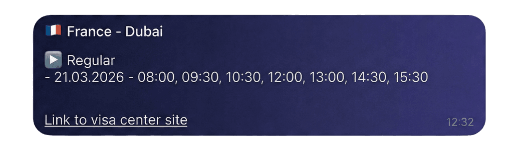 Visard updates visa centres websites every 3 seconds. If there are available time slots, it sends notifications at the same moment.